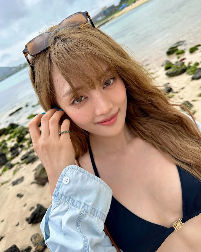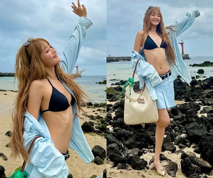 Minnie wore a light blue denim shirt over a black triangular bikini and matching a low-rise denim pleats skirt to showcase her refreshing and stylish styling. In addition, brown tone sunglasses and leather handle canvas bag added a luxurious mood.