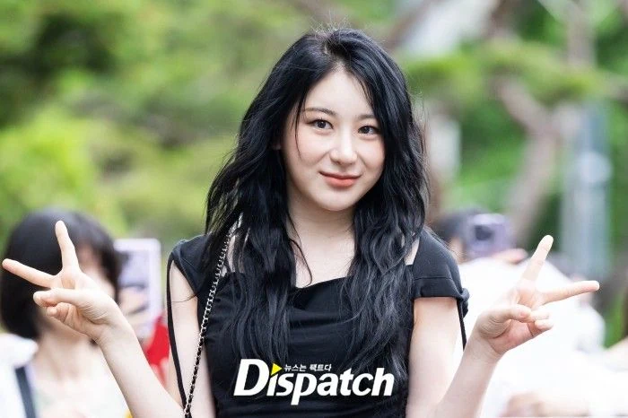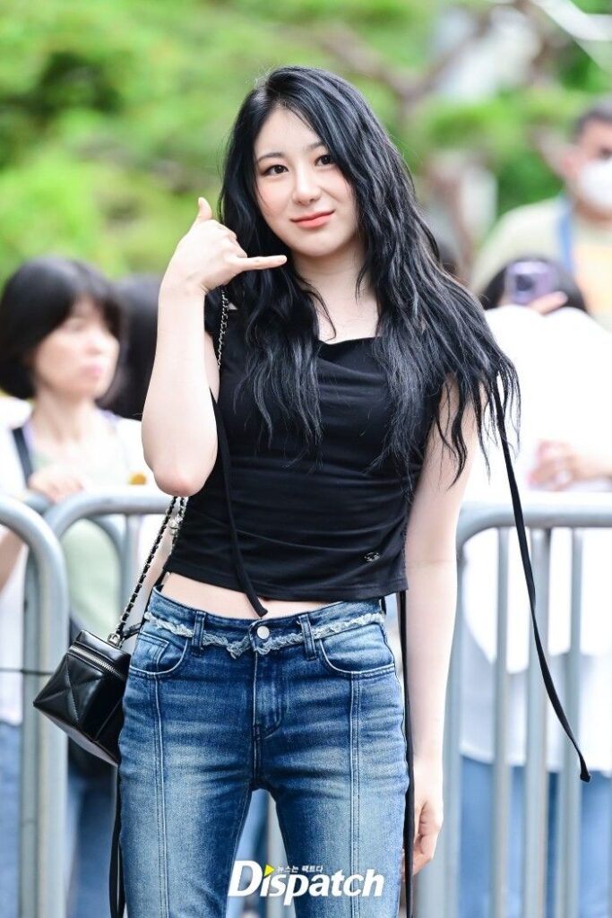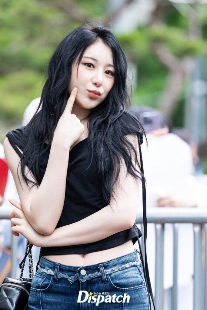 Lee Chae-yeon dressed up with a black crop top and denim pants. The doll-like visuals stood out.