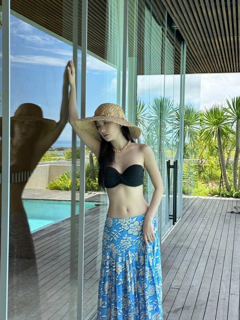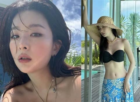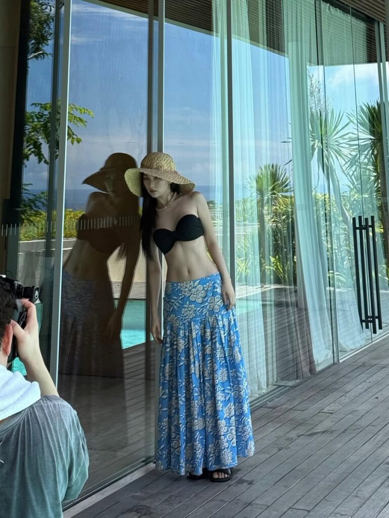 Among them, the look that caught the most attention was one featuring a black bikini top paired with a flowing blue maxi skirt. In particular, the clearly visible abdominal lines beneath the bikini top drew admiration, suggesting Seulgi’s usual rigorous self-care.