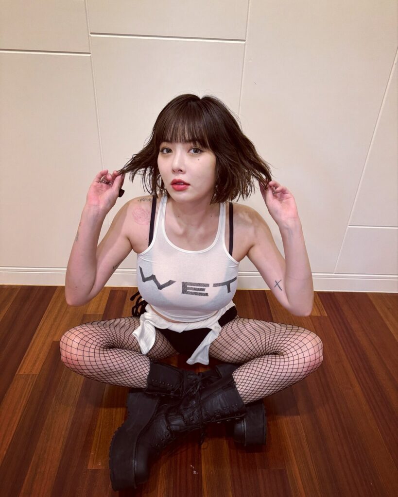 In the picture, HyunA is eye-catching, wearing a thin cropped T-shirt with black underwear. In particular, she boasts a perfect body with ultra-mini pants and mesh stockings.