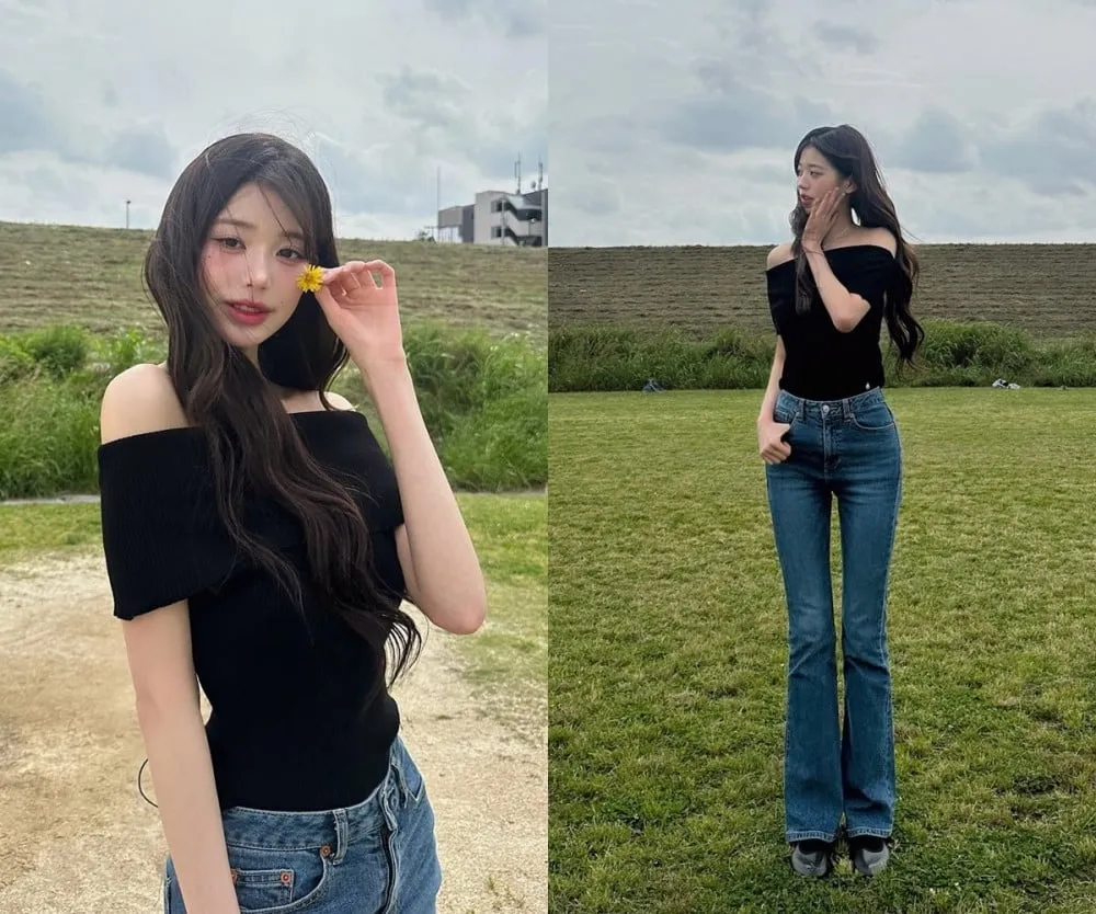 In the photos, Jang Wonyoung strikes a pose in an open field. Wearing a black off-shoulder t-shirt and jeans, she captivated viewers with her slender legs and doll-like appearance.