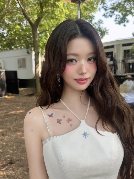 In the picture, Jang Wonyoung poses in front of the camera after wearing fairy-like stage makeup with blue shadows as the point. The butterfly tattoo stickers and colorful features on the collarbone line catch the eyes of the viewers.