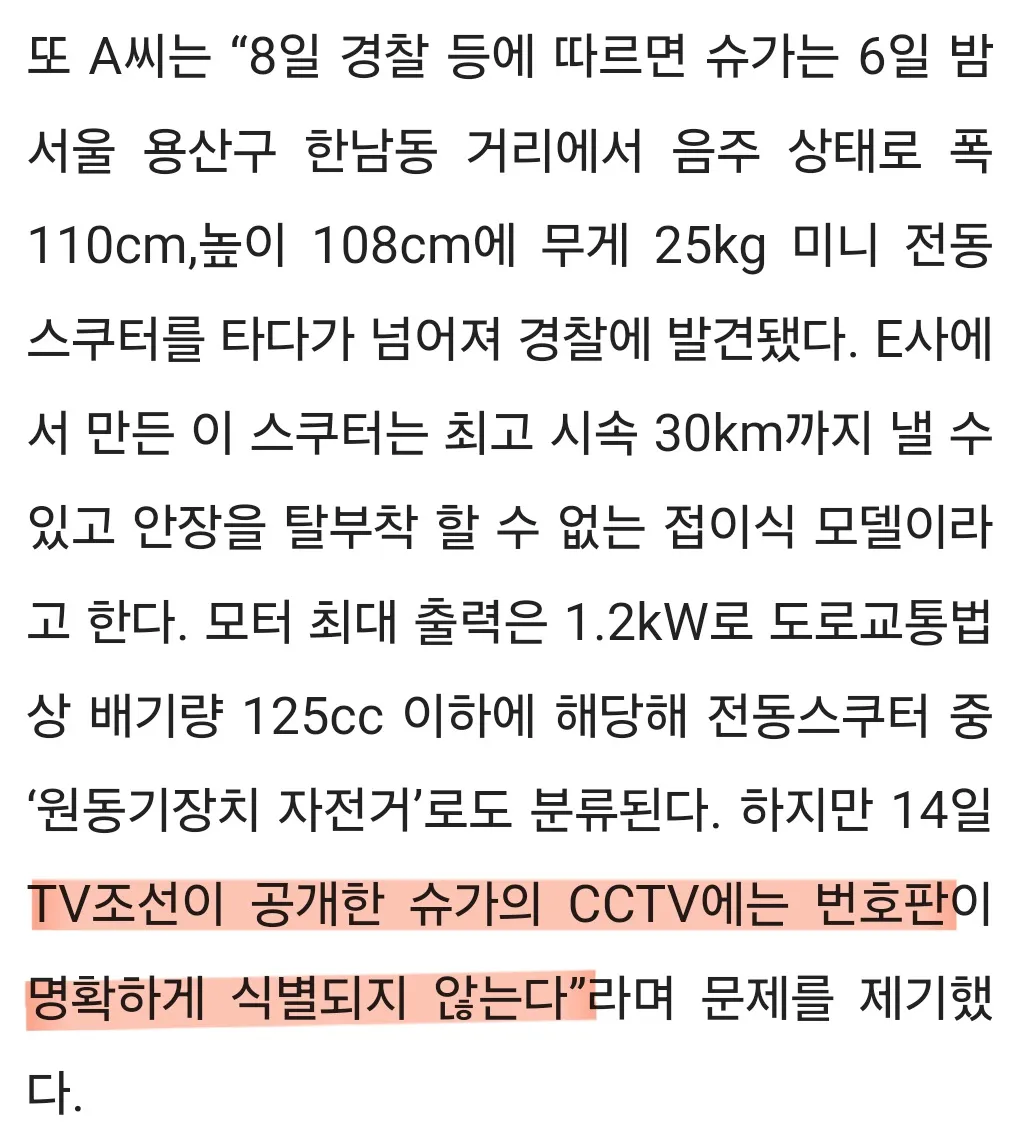 According to the article, the CCTV released by TV Chosun does not show the license plate clearly. After checking, the scooter is confirmed to be a model that needs to have a license plate after being registered at the district office. Therefore, the police will conduct an investigation regarding the allegations of Suga not having compulsory insurance and his scooter without a license plate.
