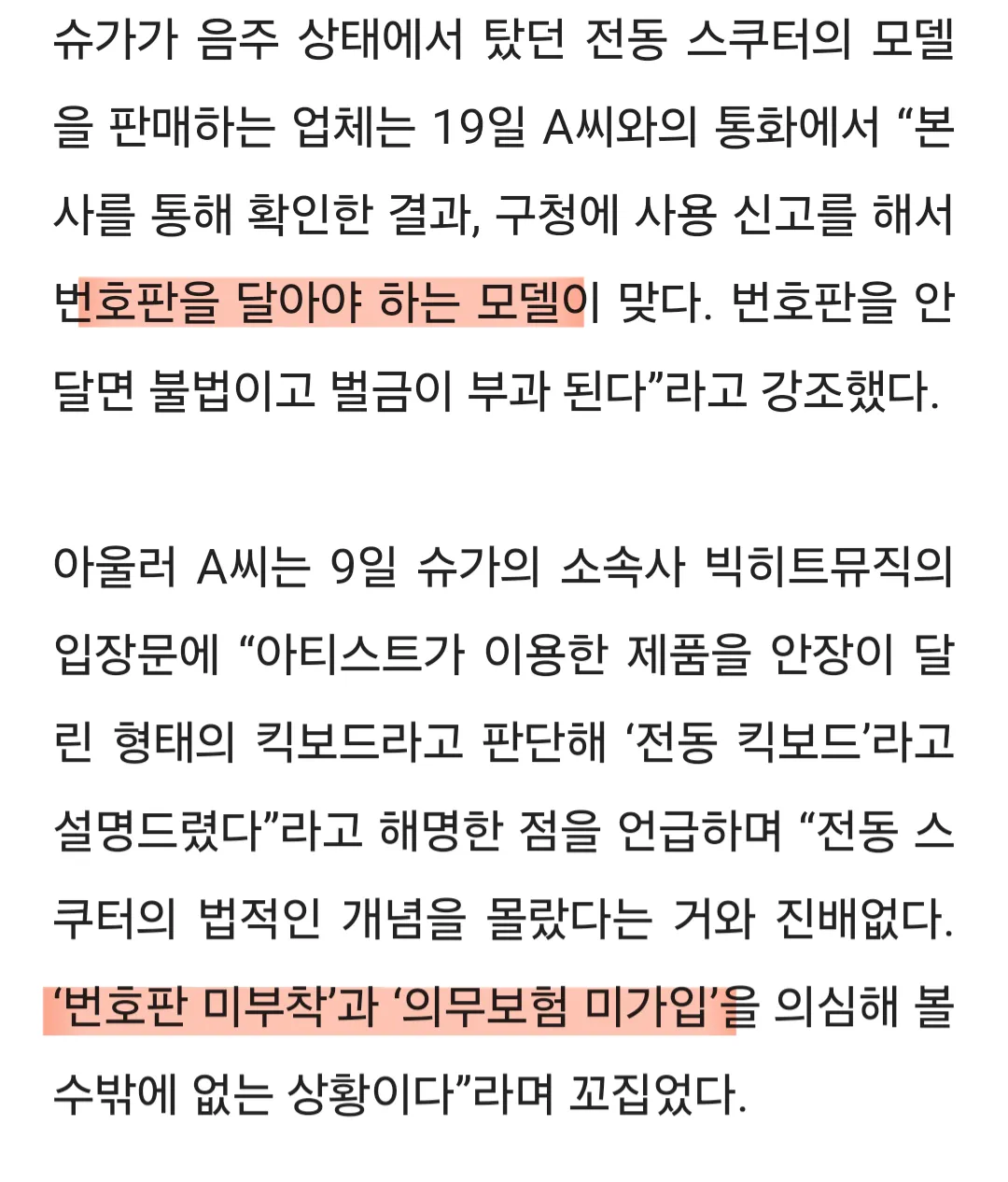 In particular, the netizen commented, “If the scooter has a license plate, it’s a lie to claim that he mistook it for a kickboard. If these suspicions are true, Suga will be subject to more severe punishment.”