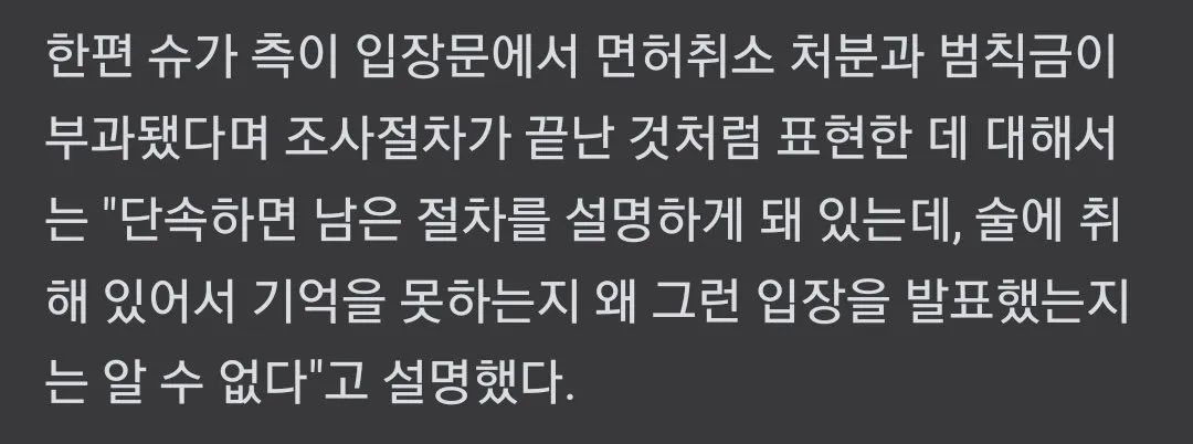 In particular, the netizen shared a part of an article in which the police mentioned the statement of Suga’s agency Big Hit Music that license revocation and fines had been imposed as if the investigation had ended. The police said, “There should be an explanation of the remaining procedures. We don’t know why they issued such a statement, possibly because Suga was drunk and unable to remember the situation clearly”.