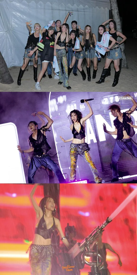 Sandara Park is seen in the photo at the WATERBOMSINGAPORE 2024 concert. Sandara Park is drawing attention as she dominates the Waterbomb Singapore stage wearing a bold costume that shows her chest line.