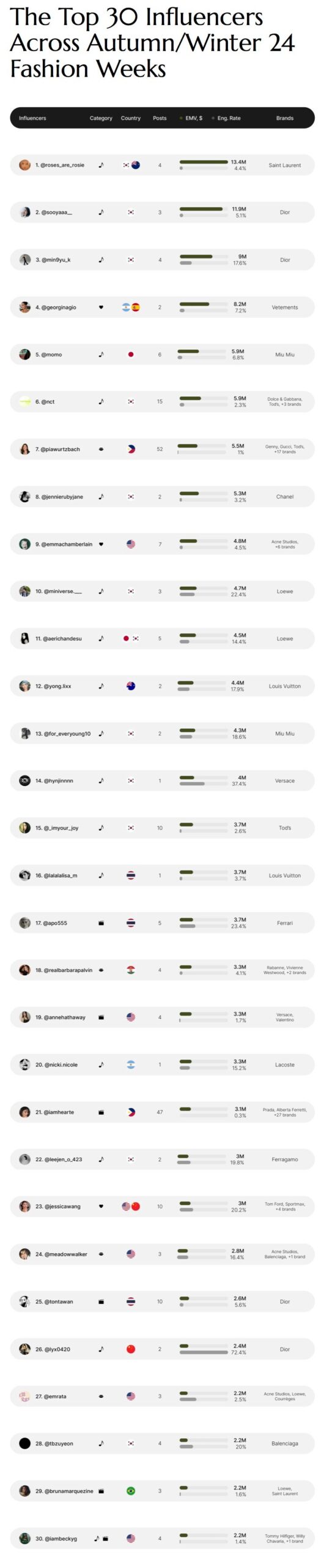 Since the list of the Top 30 (Global) Influencers with high Earned Media Value (EMV) for Autumn/Winter 2024 Fashion Weeks has been released, here is a ranking of the K-pop stars who made the list.