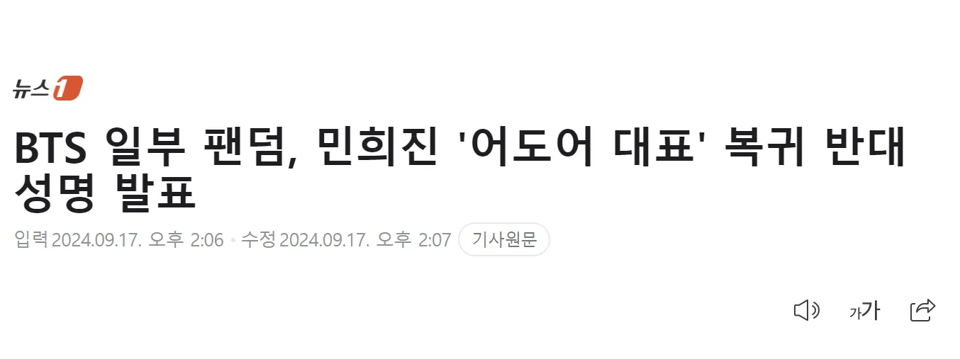 On September 16, a News1 report that claimed BTS fans had released a statement online went viral. According to the report, “some BTS fans” collectively expressed opposition to Min Hee Jin’s reinstatement as ADOR’s CEO, claiming her return would negatively impact BTS and its fanbase.
