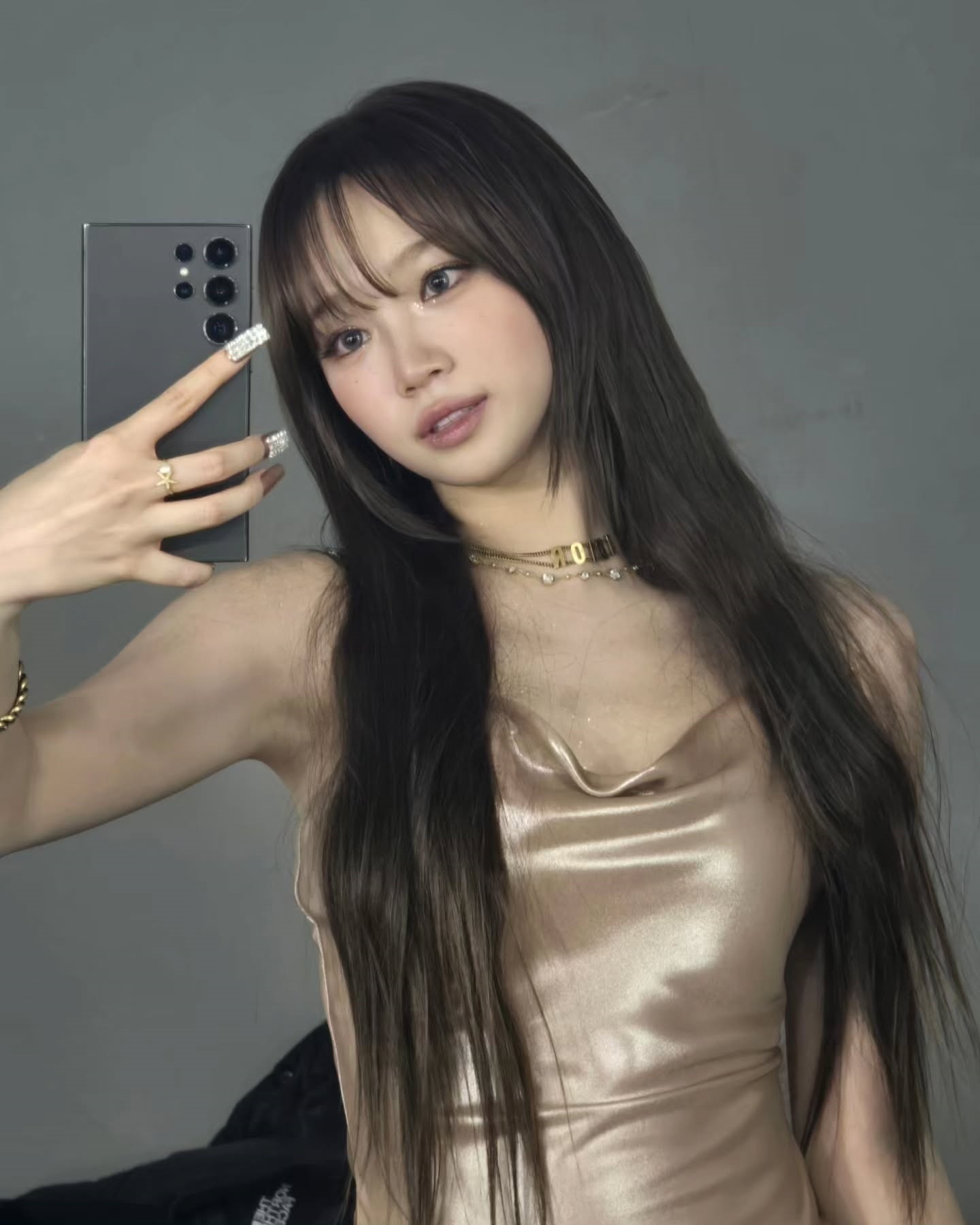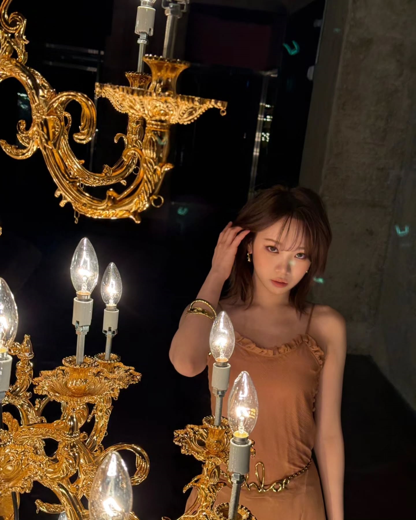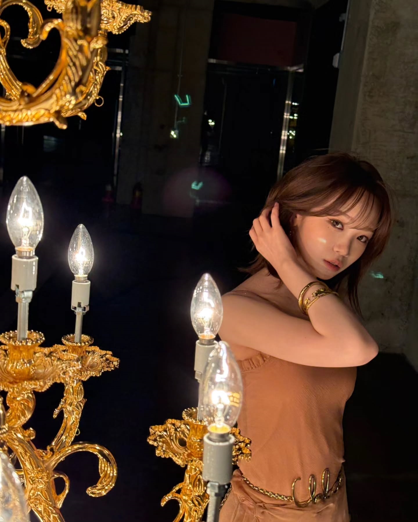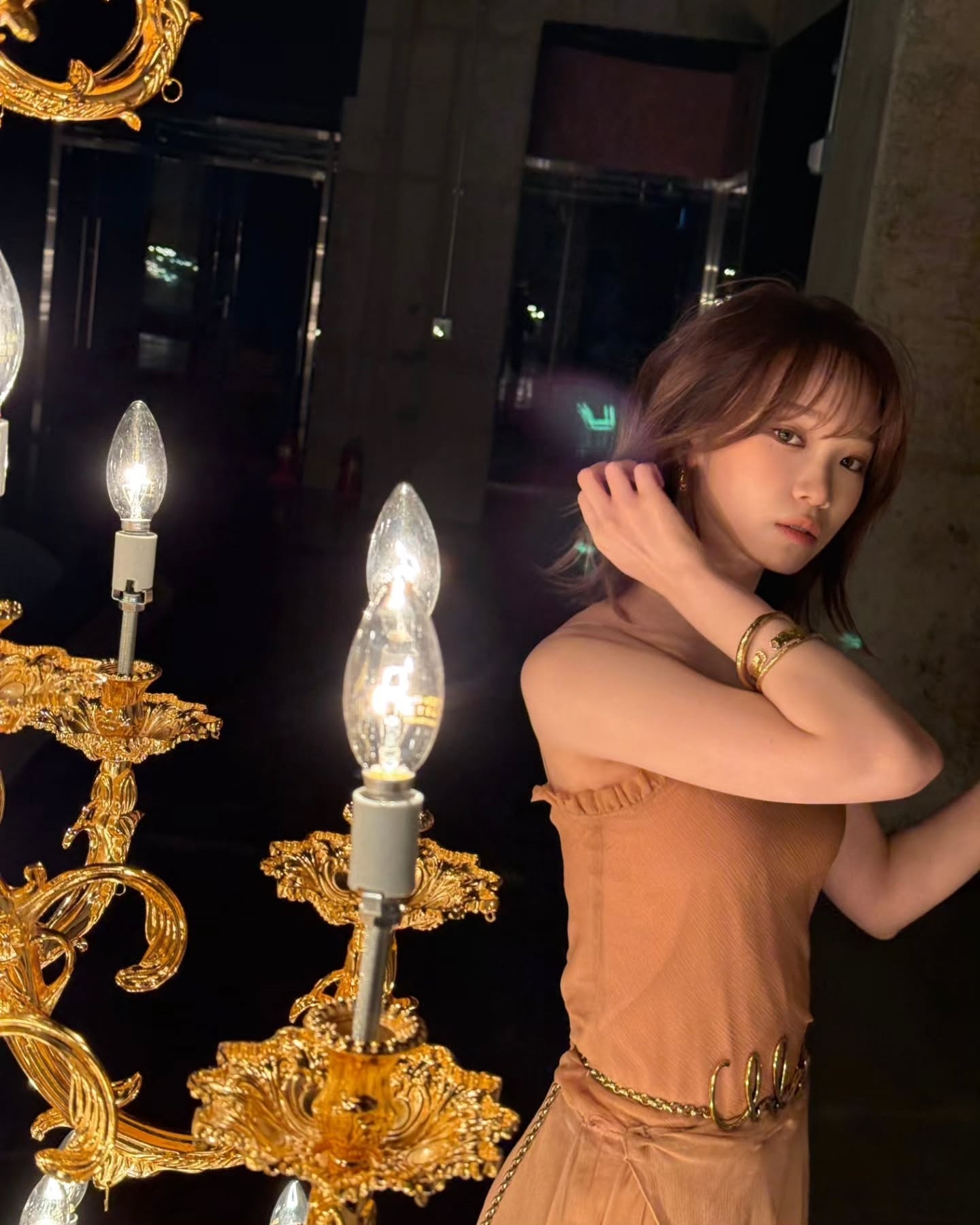 First, in the picture, Kim Chae-won is wearing a shiny gold dress and posing provocatively, emitting a subtle pearl light sprinkled from the shoulder to the collarbone line.