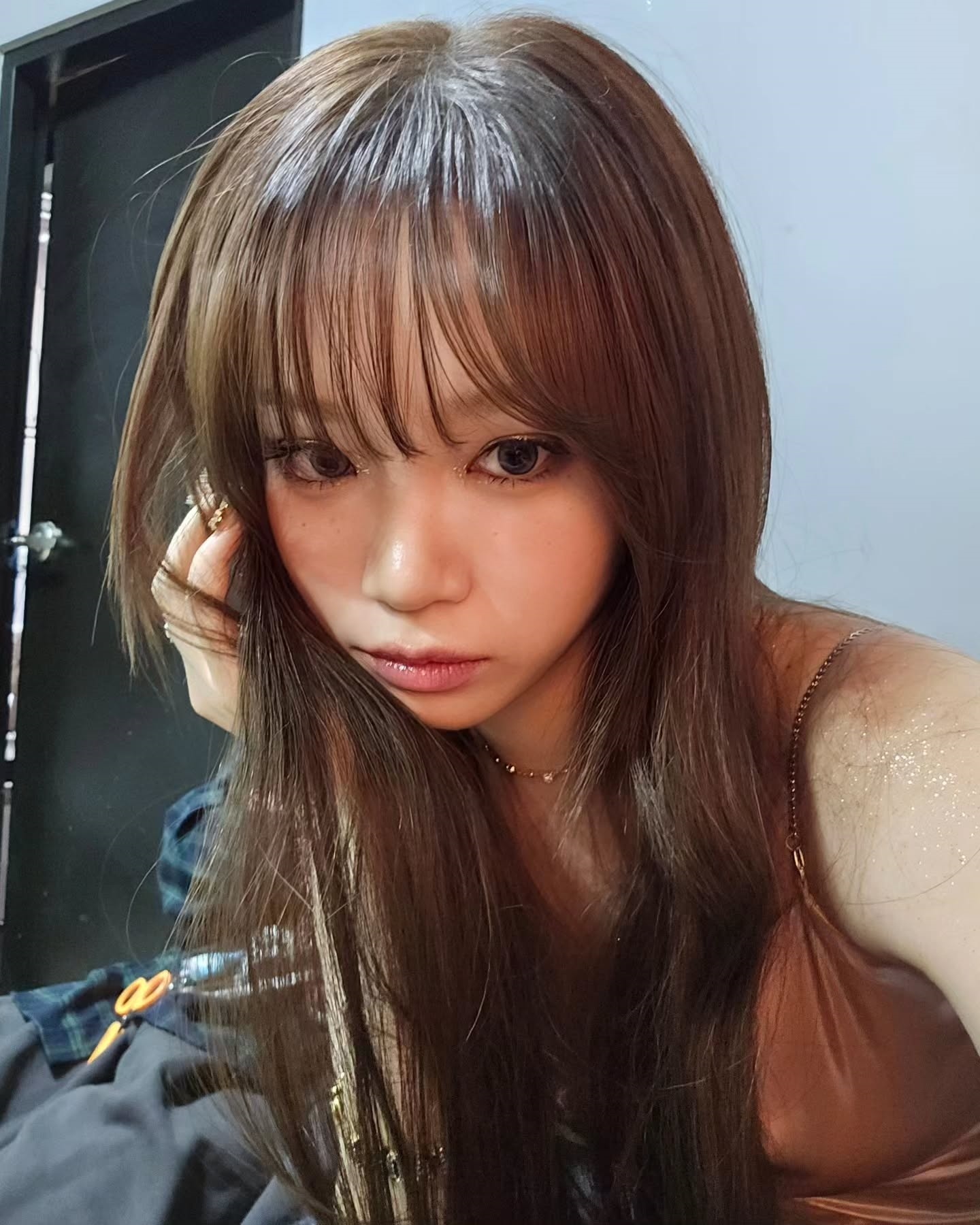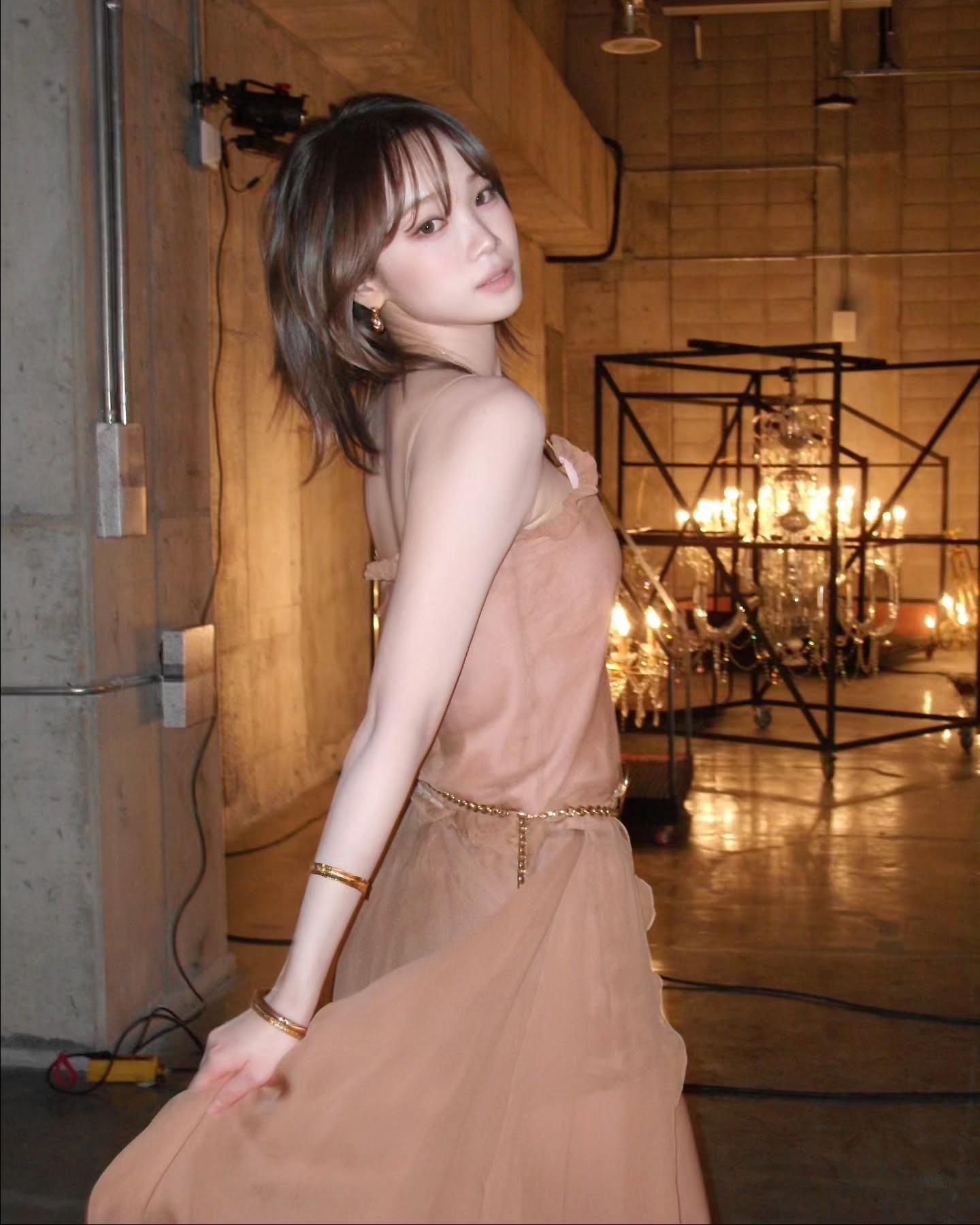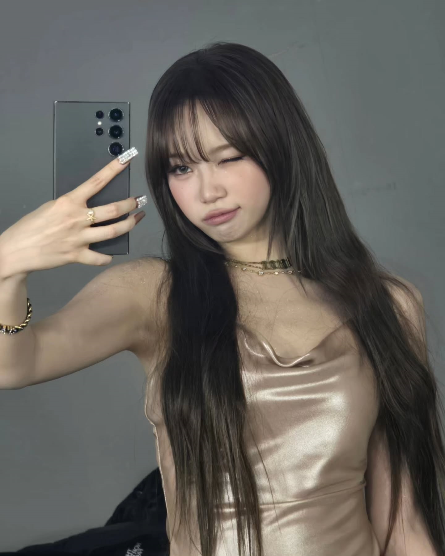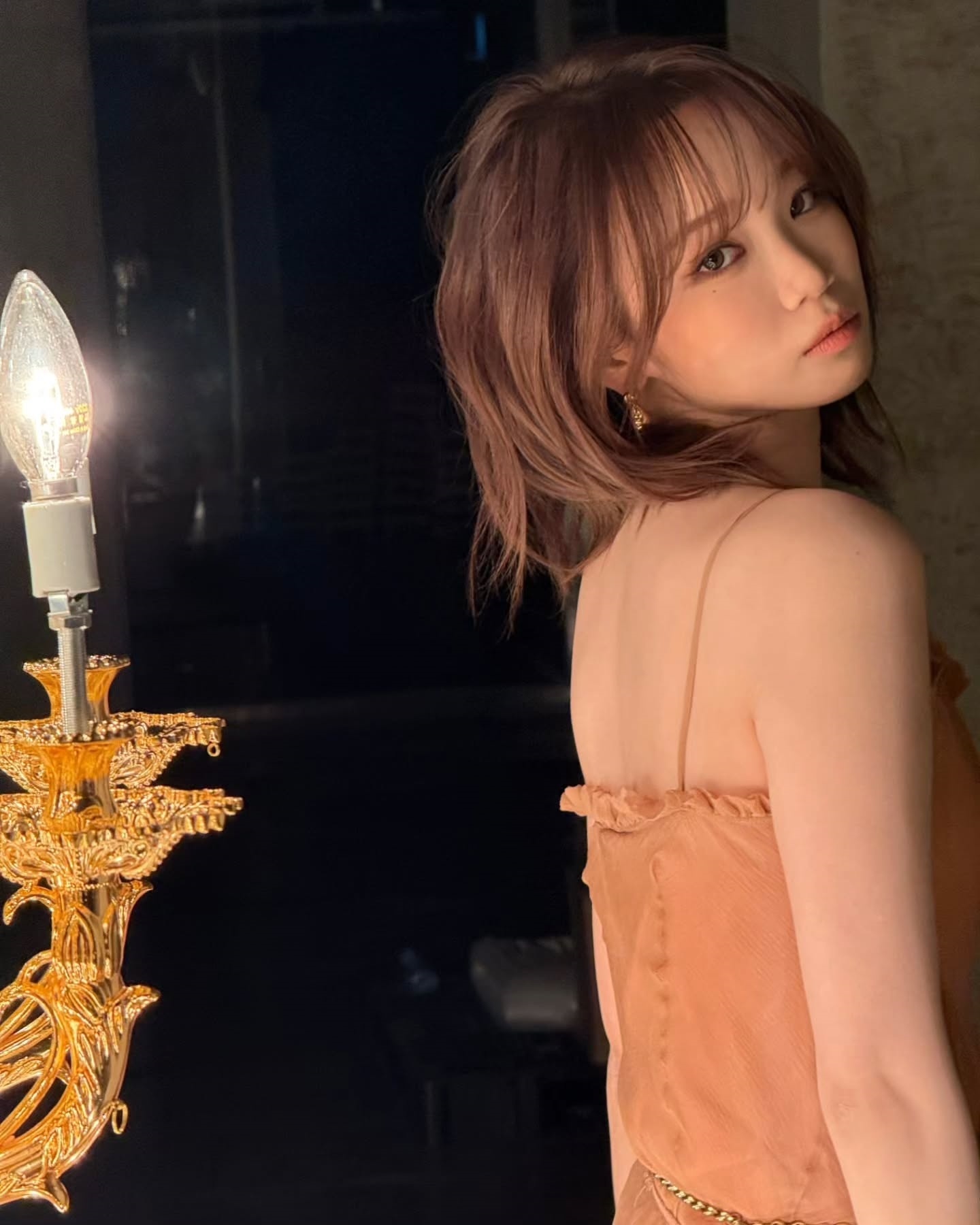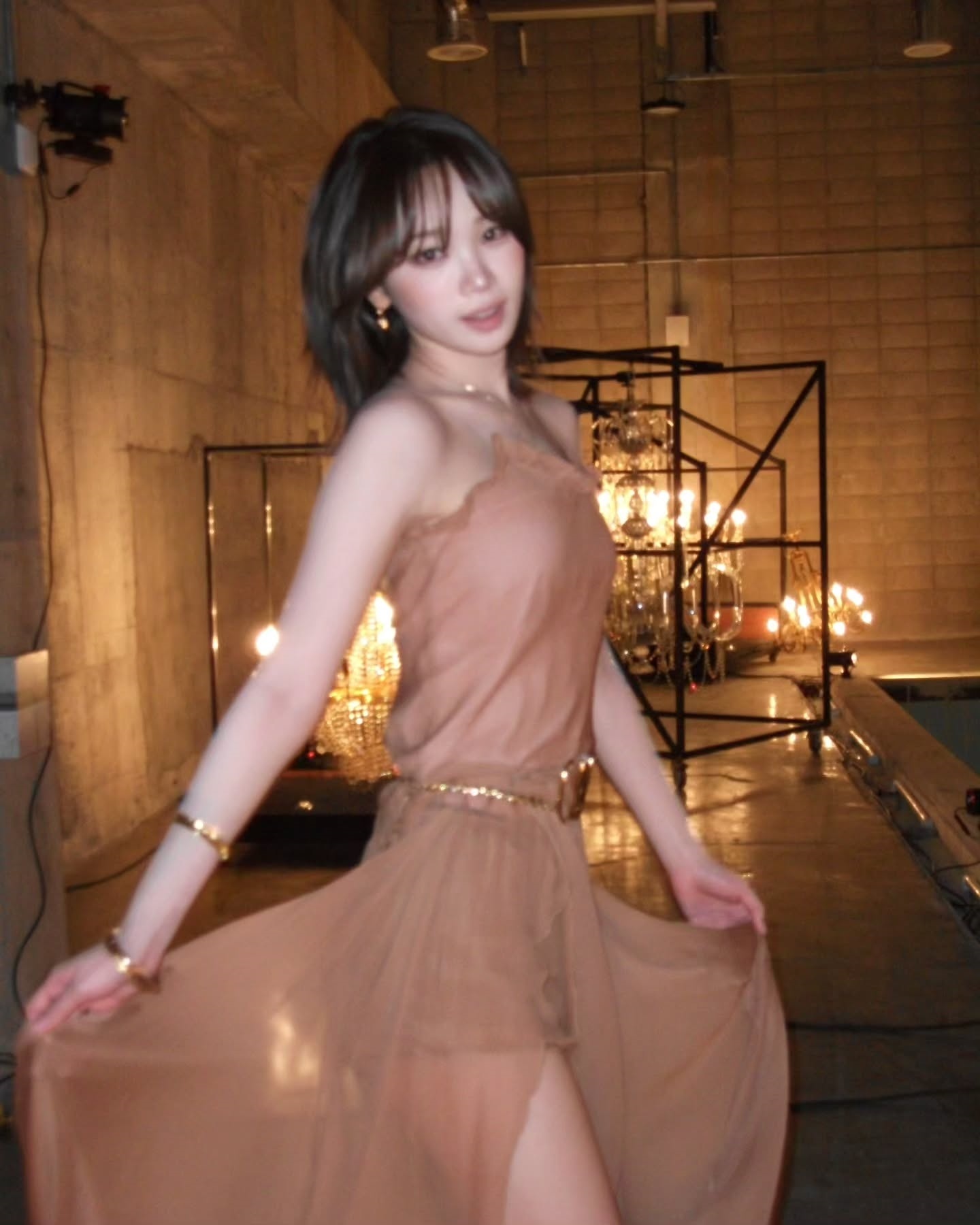 First, in the picture, Kim Chae-won is wearing a shiny gold dress and posing provocatively, emitting a subtle pearl light sprinkled from the shoulder to the collarbone line.