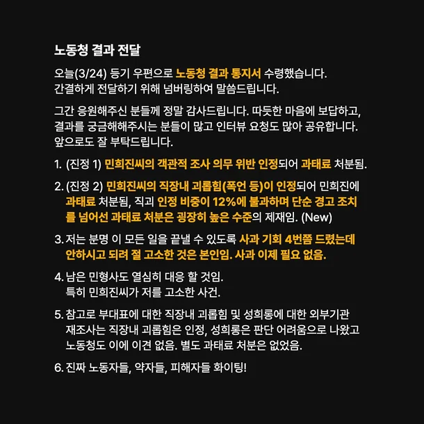 On the afternoon of March 24, former ADOR employee A publicly shared an update regarding the labor dispute, posting a statement titled “Notification of Labor Office Results.”
