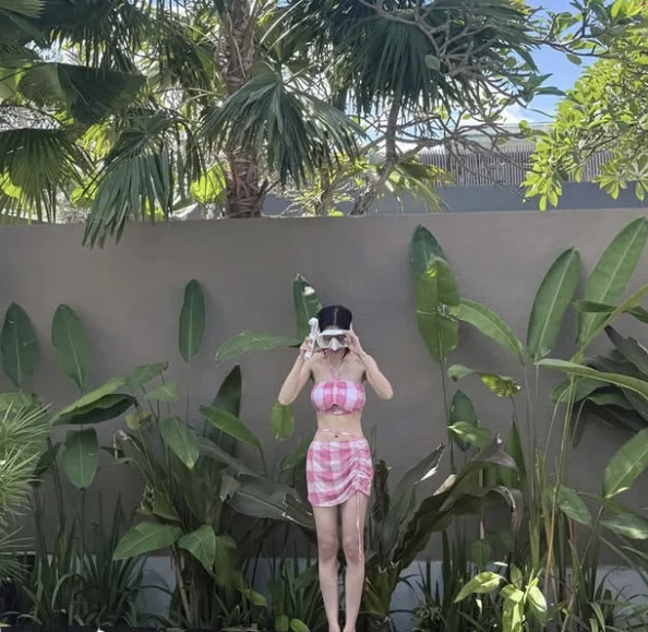 Her swimwear choices are particularly eye-catching. She sports various pink swimsuits, including checkered patterns and sleeveless designs, adding a cute touch while highlighting her toned physique and stunning proportions.