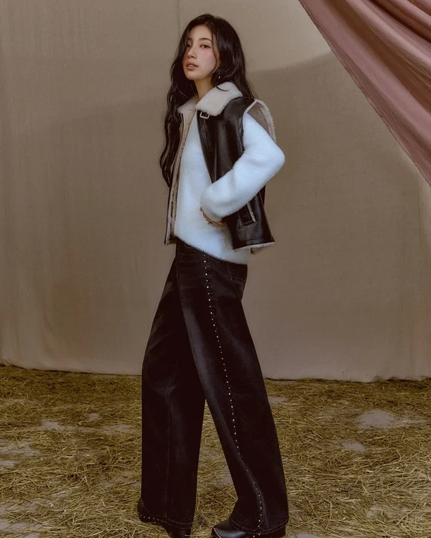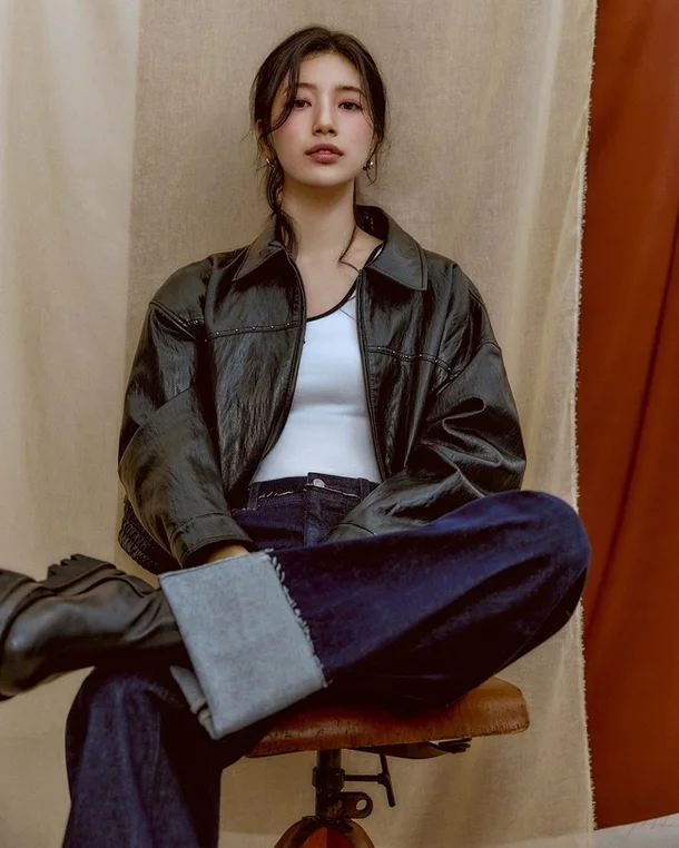 Suzy in the pictorial is attracting attention with her comfortable and unique fall styling, which combines contemporary, sensitive denim items such as brush-cut pants, loose-fit, baggy pants with new silhouettes, and wide-fit roll-up pants, along with top items that evoke bohemian sensibilities, including brown-toned suede jackets, frill-detailed blouses, and checkered shirts.