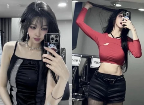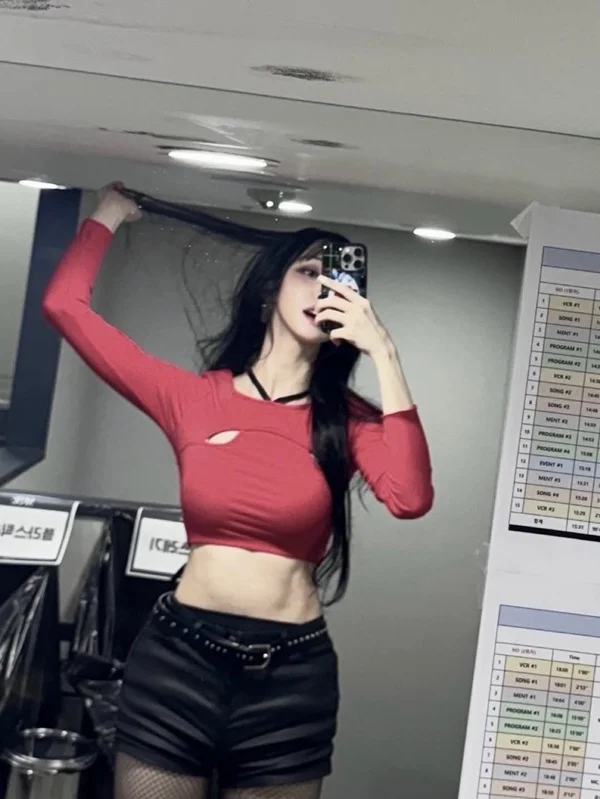The black and red-toned styling emphasized Yuju’s clear line and completed a mature mood. In the combination of crop tops and slim pants, the waistline was clearly revived, and the naturally revealed silhouette shows a clean body care. With bold makeup and accessories added to this, the stage concept became clearer.