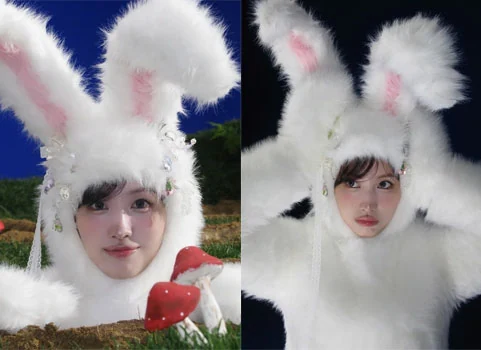 In the picture, Momo wore a rabbit costume made of white fur with ears rising up and perfectly acted as a “real-life rabbit.” The mysterious aura was emitted with dreamy smokey makeup, and the appearance of staring at the camera while wearing a large rabbit glove triggered a “heart attack” from fans.